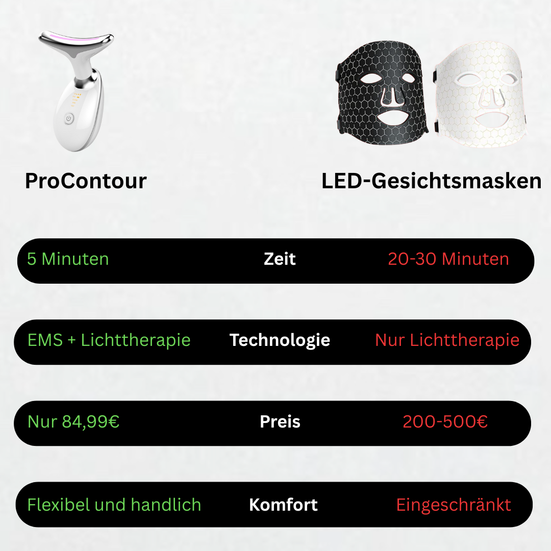 Du wirst erste Ergebnisse sehen, wenn du den ProContour konsequent täglich für 5 Minuten in deine Hautpflegeroutine einbindest. Schon nach 2-3 Wochen regelmäßiger Anwendung kann deine Haut straffer wirken und deine Konturen definierter erscheinen.